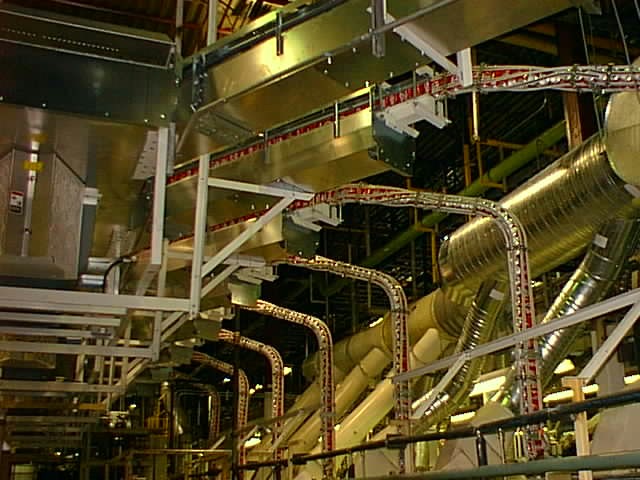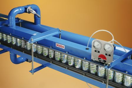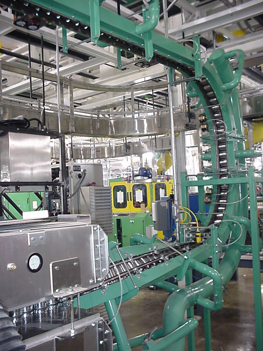 In some factories, conveyors are designed to run the length of the building. In others, there isn’t room, so the conveyors are designed to up to the ceiling. Jogger pointed out that once a conveyor is operating at peak capacity, cans move so quickly the human eye can’t follow them.