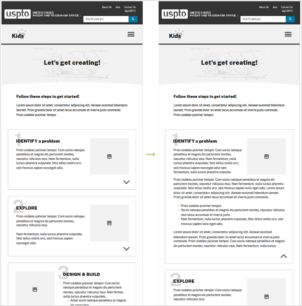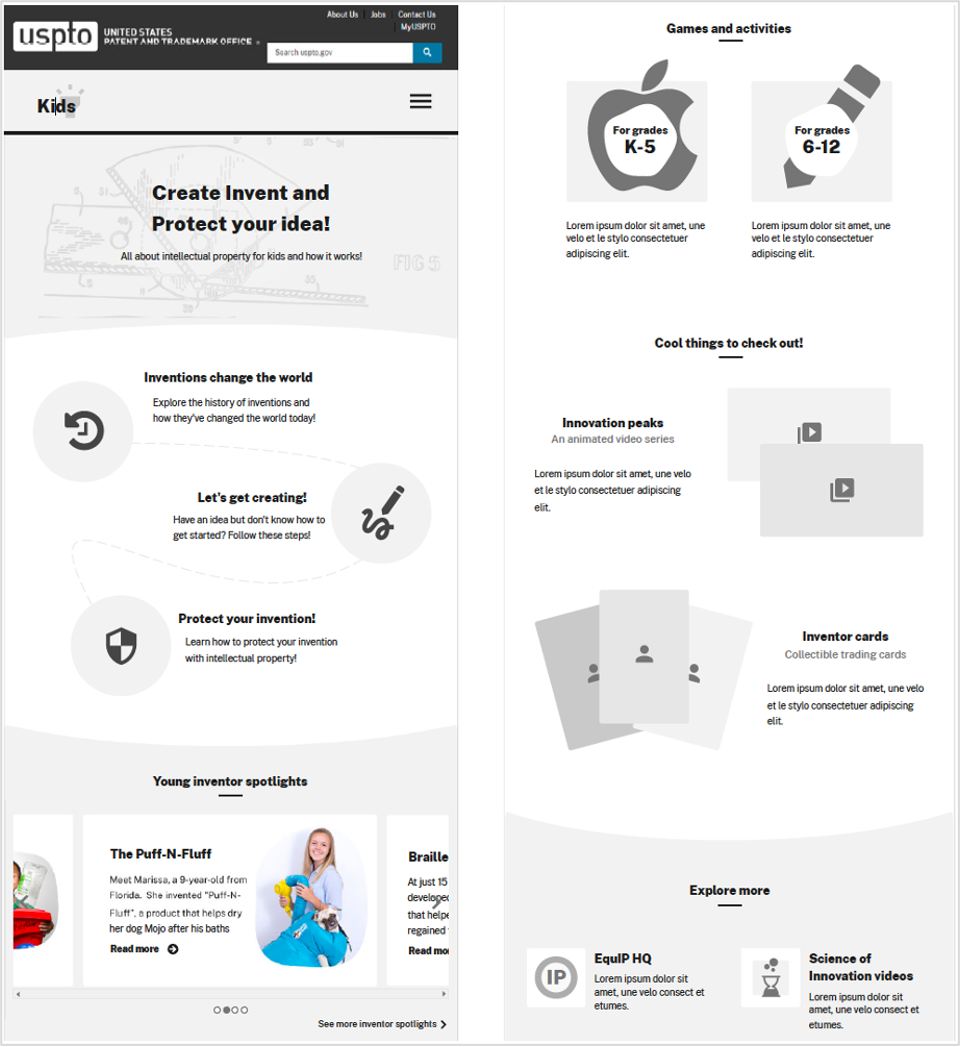 View an example of the USPTO Kids wireframe and hi-fi mockup here.
