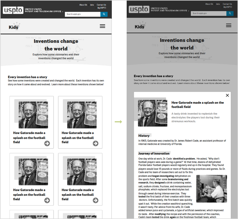 The final design provides a modern, fun, engaging and educational website for kids, educators, and parents. The responsive website can be viewed below on the United States Patent and Trademark Office's website. You can also view the release bulletin here.