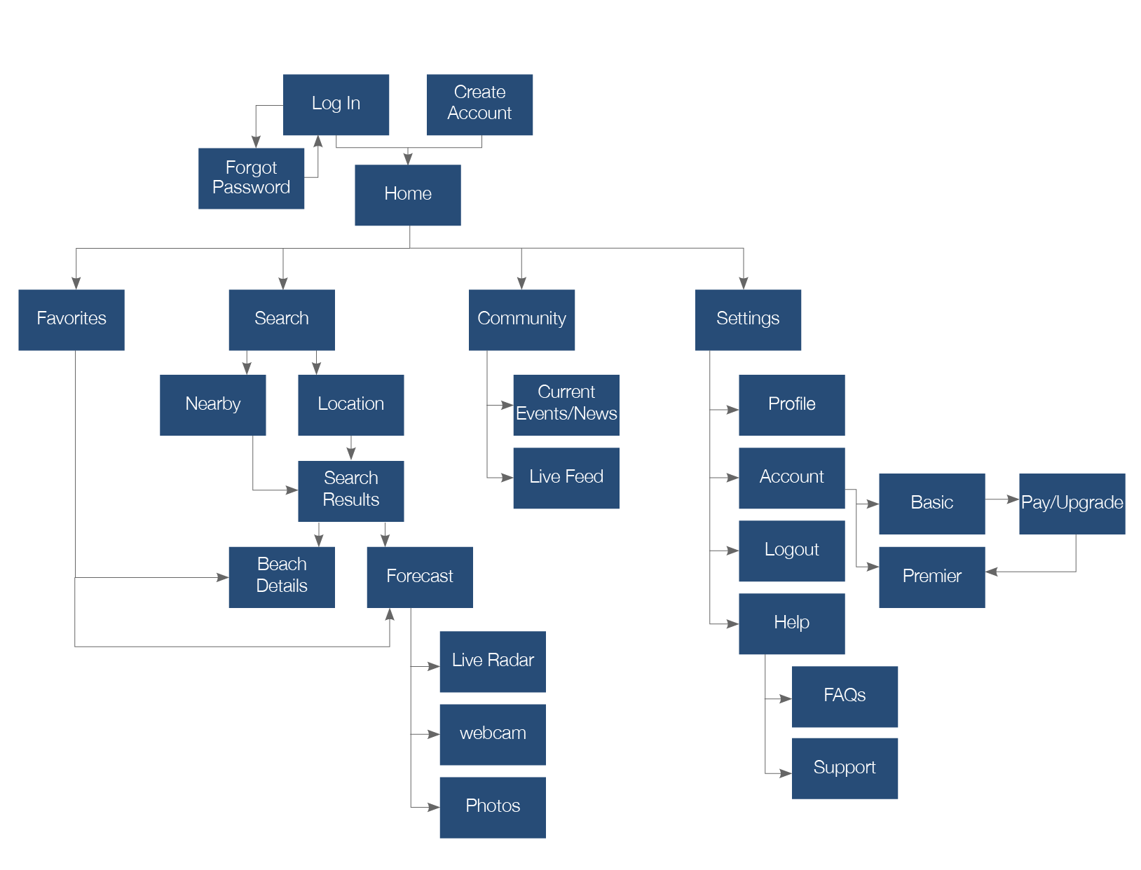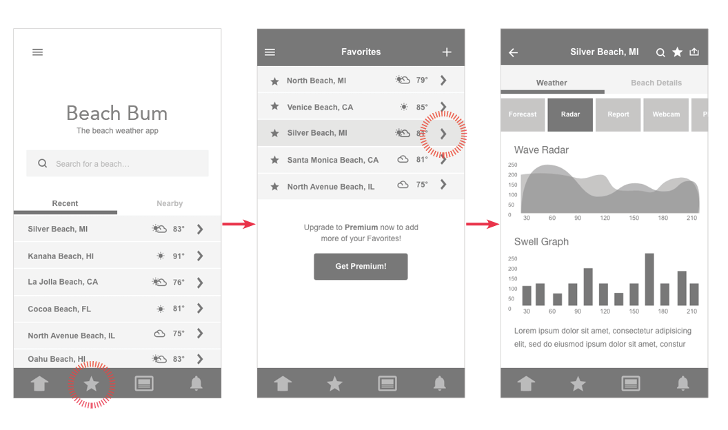 The intent of this tool was to design an application that beach lovers could quickly and easily use to check the wave and weather forecast of beaches near and far. My biggest challenge was identifying how to make wave, weather, and radar information easy to understand by all users. Creating a simple and easy-to-understand app was a key factor in differentiating Beach Bum from other existing weather apps, which were more complex and difficult to understand. Beach Bum was created not only for those who go out on the water, but those who hang on the beach and enjoy the sun. The beachside people were not as familiar with certain forecast and radar features.